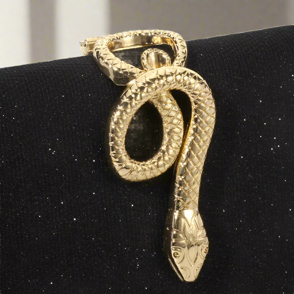 A daring golden snake adorns this sleek clutch, blending timeless elegance with a bold, captivating Italian-inspired flourish.